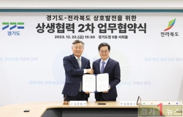 김동연 경기도지사와 김관영 전라북도지사는 22일 경기도청에서 이 같은 내용을 담은 ‘경기도-전라북도 상생번영을 위한 상생발전 2차 합의문’에 서명했다. 이번 협약은 지난 1월 17일에 이어 전라북도와 맺은 두 번째 상생협약으로 1차 8개 항목에 이어 5개 협약 항목이 추가됐다.