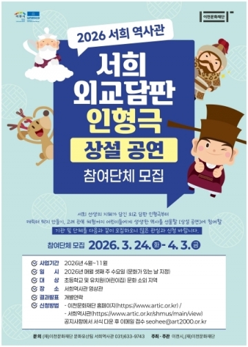 공연은 사업 기간인 4월부터 11월까지 매월 셋째 주 수요일 ‘문화가 있는 날’ 오전 10시에 정기적으로 진행된다. 참여를 희망하는 단체는 3월 말부터 4월 초까지 진행되는 집중 모집 기간에 신청할 수 있다. 참여 방법은 이천문화재단 또는 서희역사관 홈페이지 공지사항에서 서식을 내려받아 작성한 후 담당자 이메일로 접수하면 되며, 선정 결과는 개별 연락을 통해 안내된다.