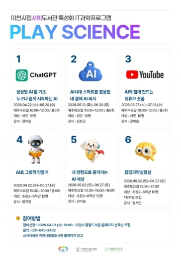 [이천1뉴스] 한철전 기자= 이천시립서희도서관이 시민의 디지털 역량 강화와 미래 기술 이해를 돕기 위한 특성화 프로그램 ‘PLAY SCIENCE’를 운영한다고 31일 밝혔다. 이번 프로그램은 인공지능(AI) 기술이 일상 전반으로 확산되는 시대 흐름에 발맞춰, 인공지능(AI) 활용 교육과 과학체험 프로그램으로 구성됐다.